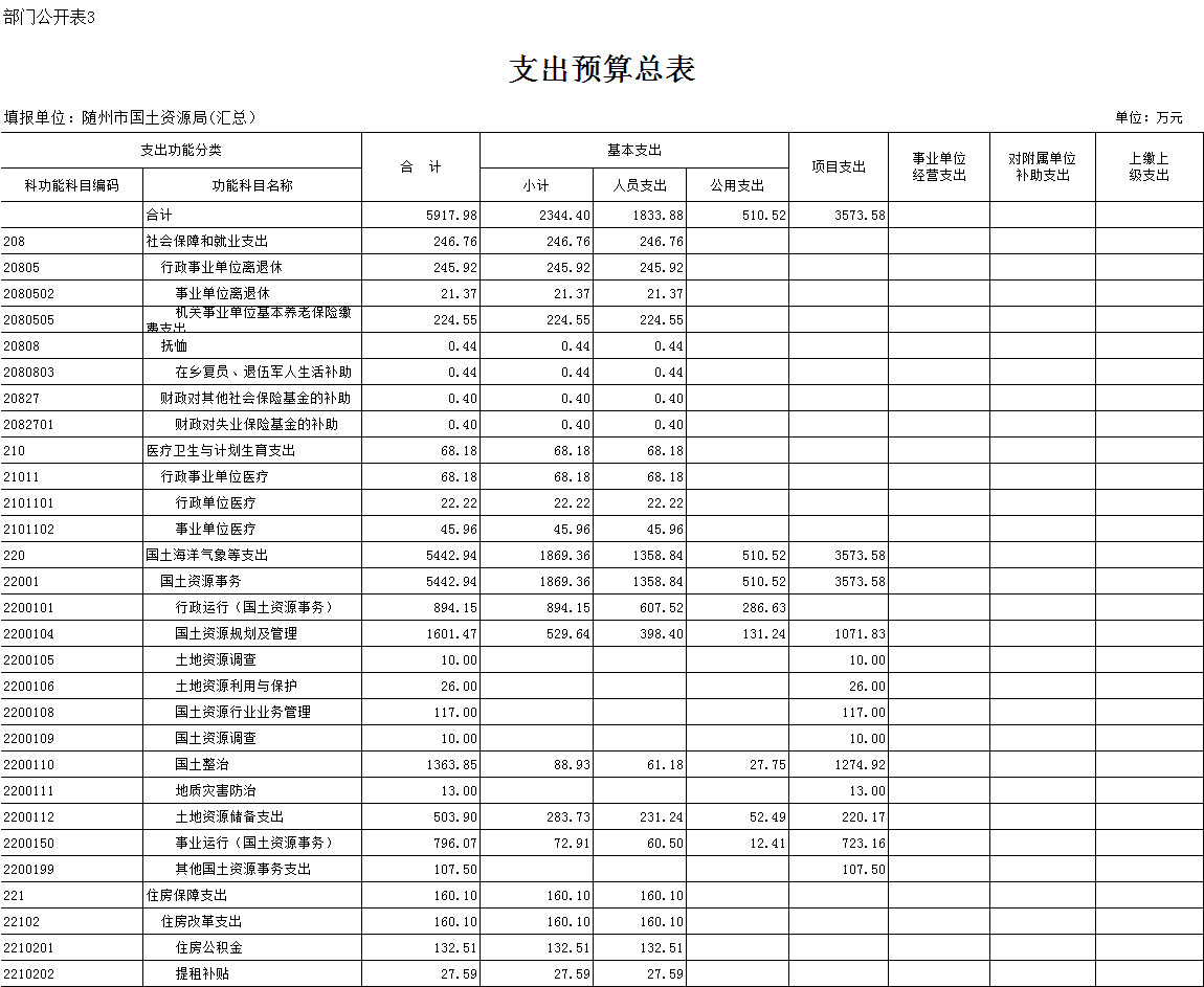 隨州市國土資源局2018年度系統匯總支出預算合計5917.98萬元。其中基本支出2344.4萬元,項目支出3573.58萬元。比上年度預算支出總額8841.82萬元減少2923.84萬元,減少比例33.07%。主要原因是減少了耕地占補平衡、集體土地確權登記、土地開發復墾等項目支出。