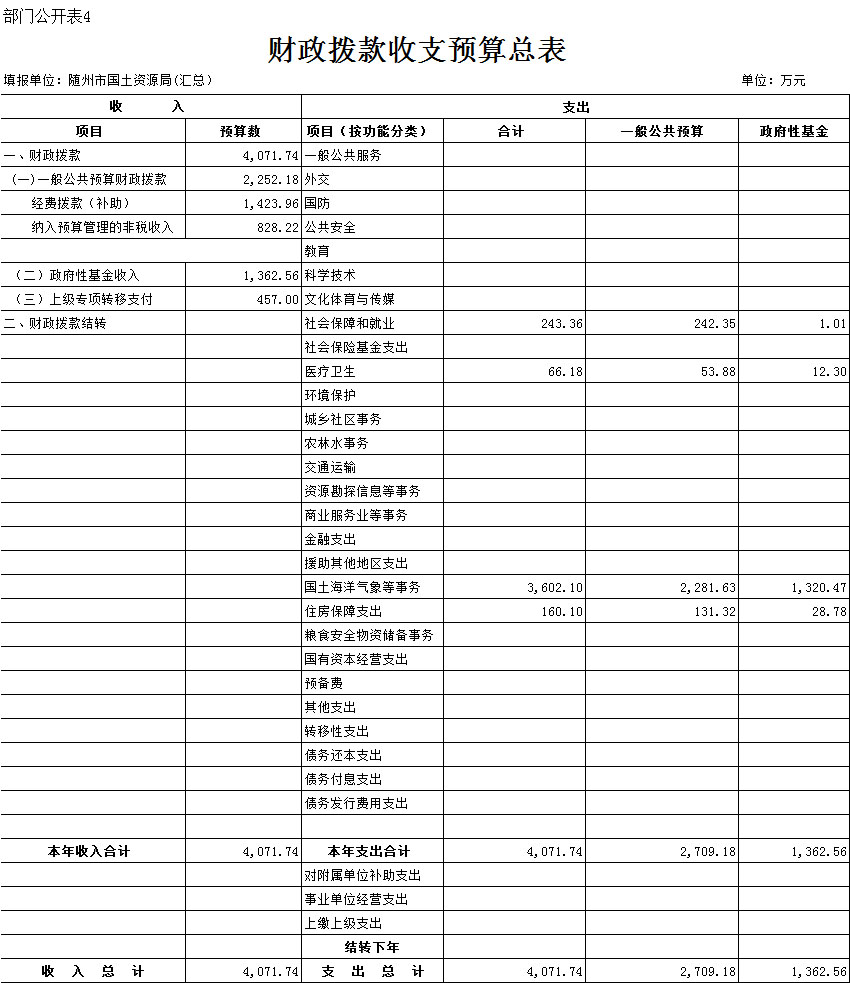隨州市國土資源局2018年度系統匯總財政撥款支出預算合計4071.74萬元,其中一般公共預算財政撥款支出2709.18萬元,政府性基金支出1362.56萬元。比上年度財政撥款預算支出總額4442.46萬元減少370.72萬元,減少比例8.34%。主要原因是根據財政局預算編報要求五項獎勵工資、退休人員工資未納入預算。