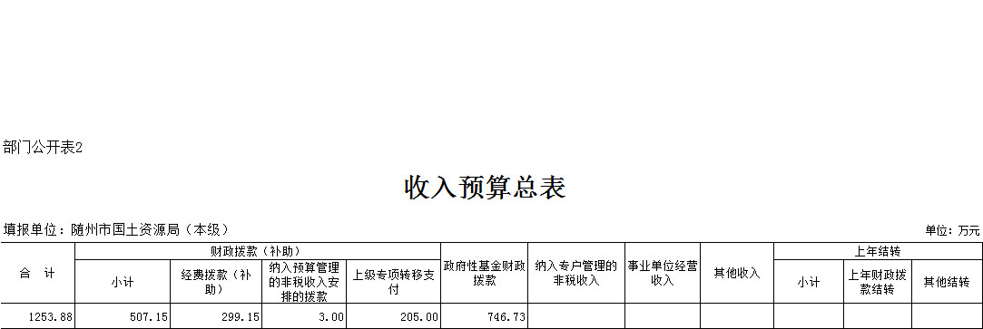 隨州市國土資源局本級2018年度收入預算合計1253.88萬元,其中公共預算財政撥款(補助)507.15萬元,政府性基金收入746.73萬元。比上年度預算收入總額1479.14減少225.26萬元,減少比例15.23% 。主要原因是減少了規劃修編、集體土地確權等項目收入。