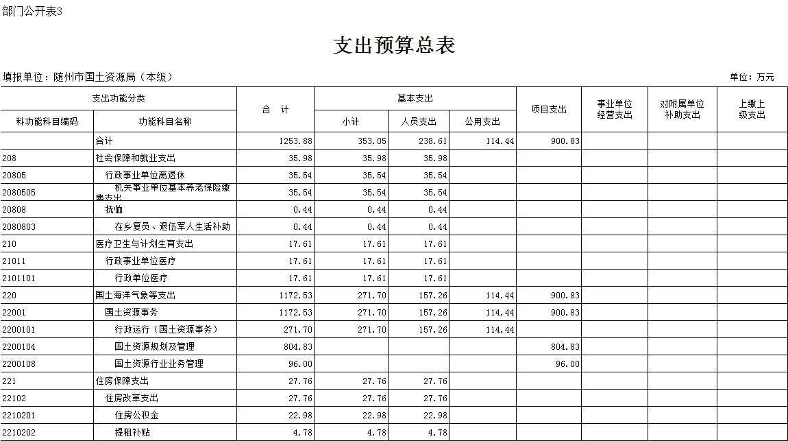 隨州市國土資源局本級2018年度支出預算合計1253.88萬元,其中基本支出353.05萬元,項目支出900.83萬元。比上年度預算支出總額1479.14減少225.26萬元,減少比例15.23% 。主要原因是減少了規劃修編、集體土地確權等項目支出。