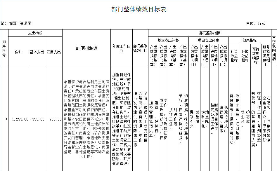 績效目標值情況說明:1、基本支出主要用于保障機關工作人員各項工資支出及國土資源管理工作正常運轉的各項費用。2、項目支出包括隨州市第三次土地調查、全市地質災害防治、隨州市曾都隨縣廣水地質災害詳細調查、土地利用總體規劃、隨州市本級2018年國有建設用地計劃編制、2017年公示地價體系建設、國土資源執法巡查快速反應體系指揮中心建設、信息化建設等國土資源業務管理支出,主要用于保障全市各項國土業務的更好開展。3、2018年我局進一步規范財政資金的管理,強化財政支出績效理念,提升部門責任意識,提高資金使用效益,促進自然資源工作的發展。