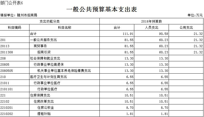 市招商局2018年財(cái)政撥款支出預(yù)算111.91萬元,較上年減少56.65萬元,同比下降33.6%,主要是因?yàn)橐话愎卜?wù)中招商引資項(xiàng)目預(yù)算支出減少。其中:人員支出90.59萬元,比上年增加30.35,同比增長(zhǎng)50.4%,公用支出21.32萬元,比上年增加3.13,同比增長(zhǎng)17.2%,主要是因?yàn)槿藛T增加,人員工資、養(yǎng)老保險(xiǎn)、公積金等相應(yīng)增加。按支出功能分,一般公共服務(wù)支出81.55萬元,社會(huì)保障和就業(yè)支出13.30萬元,醫(yī)療衛(wèi)生與計(jì)劃生育支出6.55萬元,住房保障支出10.51萬元。
