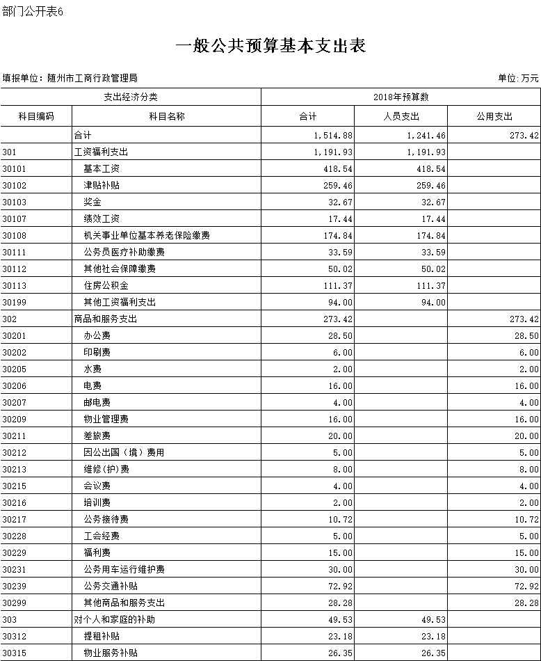 隨州市工商局2018年財政撥款支出1694.88萬元,比上年減少267.44萬元,減幅13.63%。主要是按2018年預算口徑未將獎勵性工資納入年初預算。其中:工資福利性支出1191.93萬元,對個人和家庭補助支出49.53萬元,公用支出273.42萬元,項目支出150萬元,其他資本性支出30萬元。