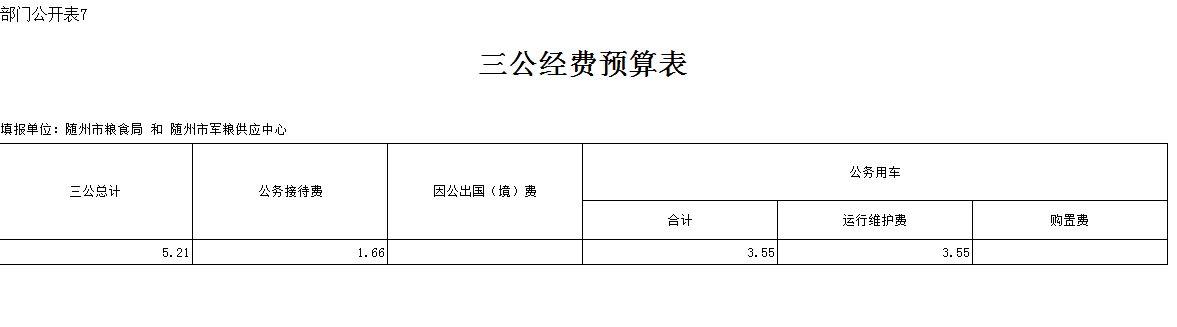 3.公務用車情況。糧食部門(隨州市糧食局)核定公車編制1臺,實有1臺。2018公務用車運行維護費3.55萬元,與上年基本持平。財政撥款公務用車購置費0萬元,與上年一樣。