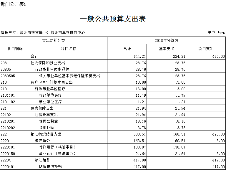2018年糧食部門財政撥款預算支出總額為644.21萬元,比上年預算安排743.09萬元,減少98.88萬元,同比減少13.31%,減少主要原因是2017年隨州市糧食質量監測站整體劃給了隨州市公共檢驗檢測中心和預算中不包含退休人員的工資及職工獎勵性工資。按功能分類:機關事業單位基本養老繳費支出28.76萬元,行政事業單位醫療13萬元,住房公積金18.16萬元,提租補貼3.78萬元,行政運行138.87萬元,事業運行24.64萬元,儲備糧油補貼417萬元(其中上級專項轉移支付105萬元)。