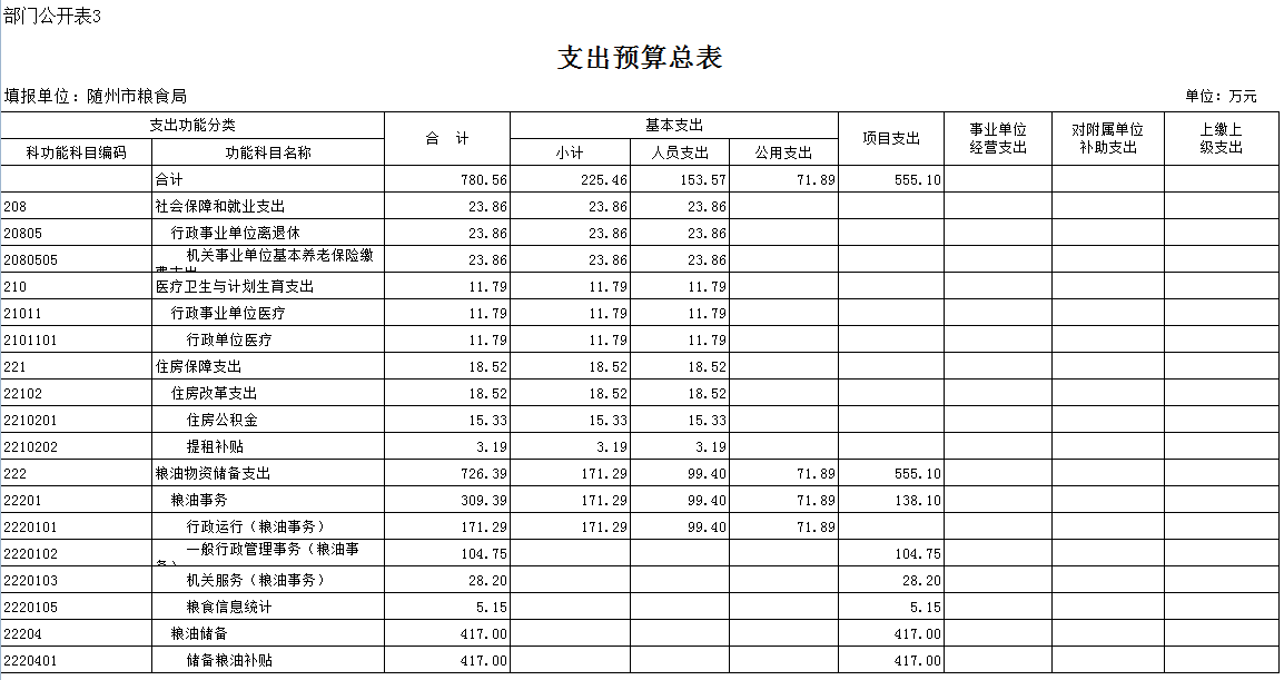 2220102 糧油物資儲備支出(類)糧油事務(款)行政運行(項):指市糧食局用于保障機構正常運行,開展日常工作的基本支出。
