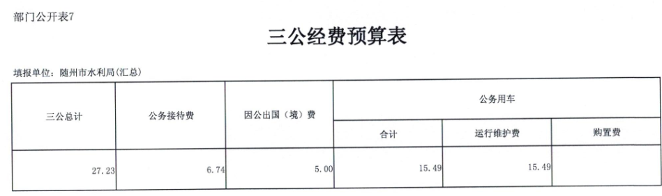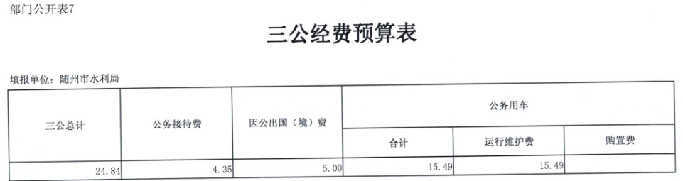 水利局本級部門“三公”經(jīng)費(fèi)預(yù)算24.84萬元,比上年增加5.57萬元,增加28.9%。其中公務(wù)接待費(fèi)4.35萬元,比上年增加1.98萬元,增加83.54%,原因:全面推行河長制和鄂北調(diào)水二期啟動公務(wù)接待增加。因公出國(境)費(fèi)5萬元,比上年減少2.3萬元,減少31.5%,原因:壓縮因公出國費(fèi)用。公務(wù)用車運(yùn)行維護(hù)費(fèi)費(fèi)15.49萬元,比上年增加5.89萬元,增加61.35%,增加原因:全面推行河長制和鄂北調(diào)水二期啟動,單位差旅下鄉(xiāng)等增加,導(dǎo)致車輛費(fèi)用增加;無公務(wù)車購置費(fèi)。