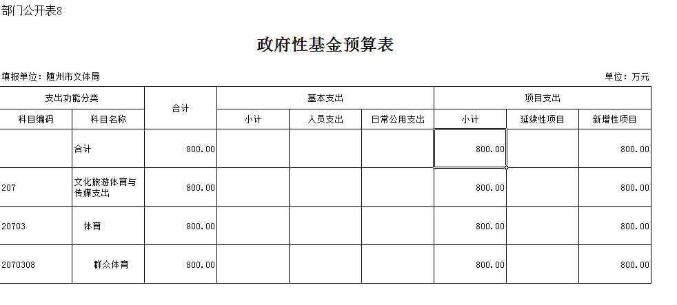 政府性基金財政撥款支出預算數為800萬元,較上年預算安排850萬元,減少50萬元,減幅6.67%,減少的原因是政府撥付其他場館維修費用50萬元。