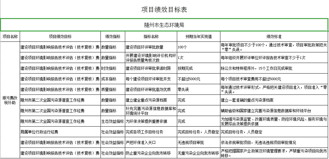 績效目標值說明:因歷史遺留問題加之排污費改稅后造成的經(jīng)費不足,為解決機關(guān)和二級單位經(jīng)費保障、全國第二次污染源普查、建設(shè)項目評審評估等工作的開展而編制的項目經(jīng)費。