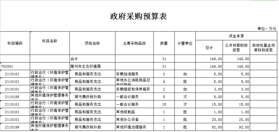 2020年我局本級政府采購預(yù)算總額為146萬元,主要為服務(wù)類預(yù)算支出。比上年增加30萬元,增加 25.86 %。主要原因是全國第二次污染源調(diào)查、環(huán)評報告評估及專項業(yè)務(wù)等項目需購買的辦公用品和第三方服務(wù)支出。