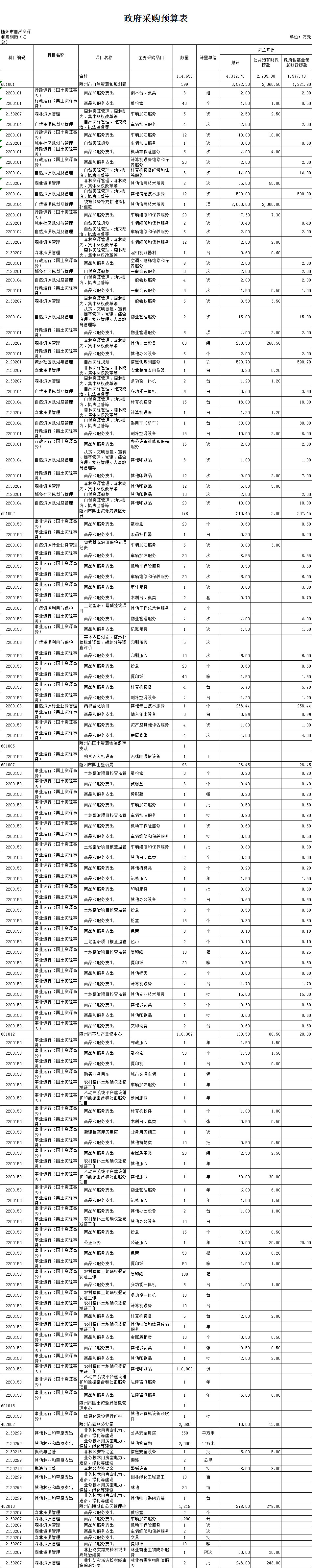 隨州市自然資源和規劃局2020年度政府采購年初預算金額總計3582.3萬元:其中服務類3224.5萬元(主要包括其他信息技術服務2555萬元,信息化規劃服務590.7萬元,車輛保養加油、會議、物業管理等服務78.8萬元),貨物類357.8萬元(主要包括森林防火專用設備260.5萬元,空調、計算機、打印機、辦公桌、鼓粉盒等貨物類97.3萬元)。隨州市自然資源和規劃局為2019年4月新組建單位,無上年對比數據。