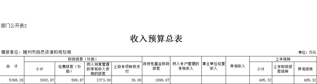 隨州市自然資源和規劃局本級2020年度收入預算合計5396.26萬元,其中:公共預算財政撥款(補助)3002.87萬元,政府性基金收入1898.07萬元,其他結轉495.32萬元。隨州市自然資源和規劃局為2019年4月新組建單位,無上年對比數據。
