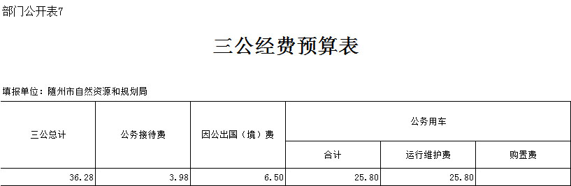 ? ?隨州市自然資源和規劃局2020年度三公經費預算合計36.28萬元,其中:公務接待費3.98萬元,因公出國(境)費為6.5萬元,公務車運行維護費為25.08萬元, 公務用車購置費2020年度無預算安排。隨州市自然資源和規劃局為2019年4月新組建單位,無上年對比數據。