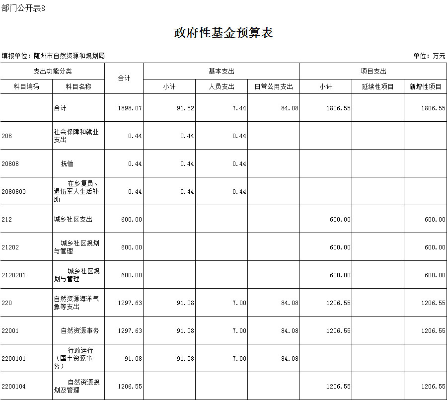 隨州市自然資源和規劃局2020年政府性基金預算合計1898.07元,其中:基本支出91.52萬元,項目支出1806.55萬元。隨州市自然資源和規劃局為2019年4月新組建單位,無上年對比數據。