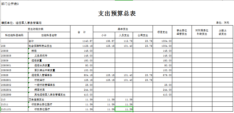 2020年,市退役軍人事務局機關財政撥款預算支出合計1140.57萬元,較上年增加了691.57萬元,同比增加154.02%,主要原因為2020年新增了基本支出以及“退役士兵社會保險接續資金”“春節、八一慰問”等項目預算。