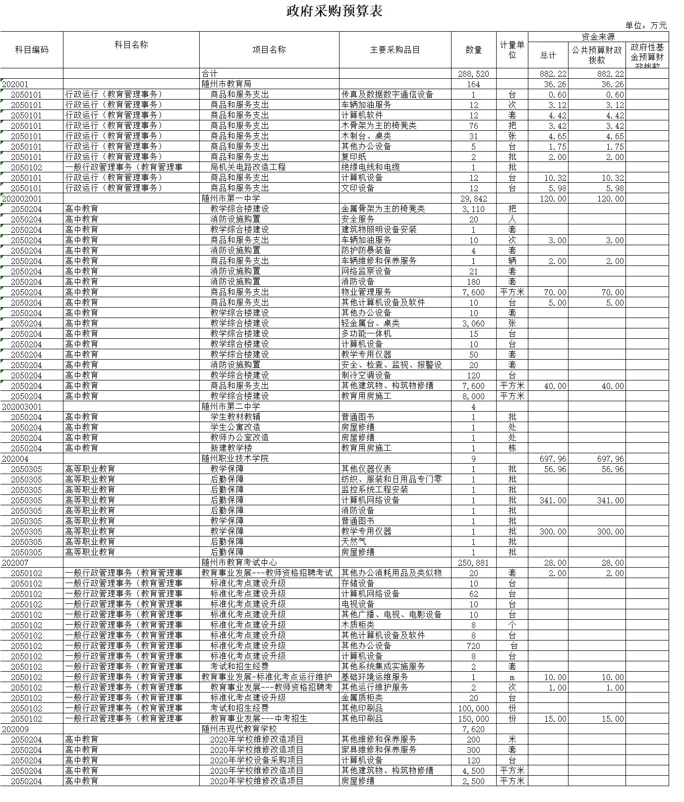 2020年,局系統匯總政府采購預算總額882.22萬元,比上年12244.31萬元減少了11362.09萬元,減少了92.79%,主要是隨州一中、隨州二中的教學樓建設項目,隨州職業技術學院的消防工程項目以及市本級教育公共服務平臺建設于2019年已經實施完成。