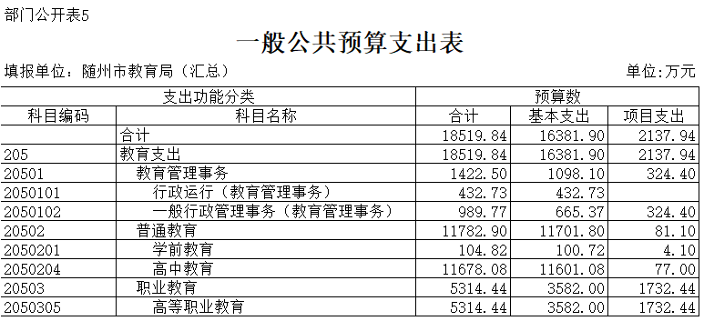 五、一般公共預算支出表