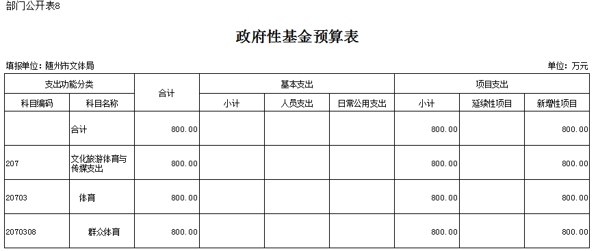 ????本級政府性基金財政撥款支出預算數為800萬元,較上年預算安排850萬元,減少50萬元,減幅6.67%,減少的原因是政府撥付其他場館維修費用50萬元。