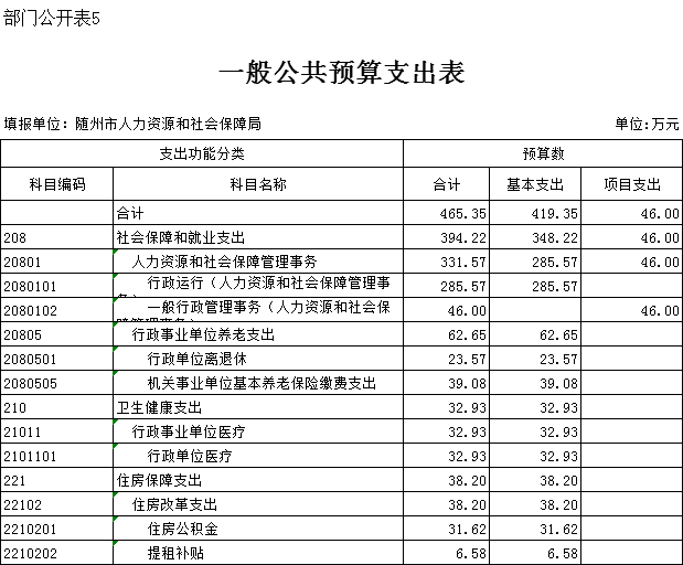 五、一般公共預算支出表