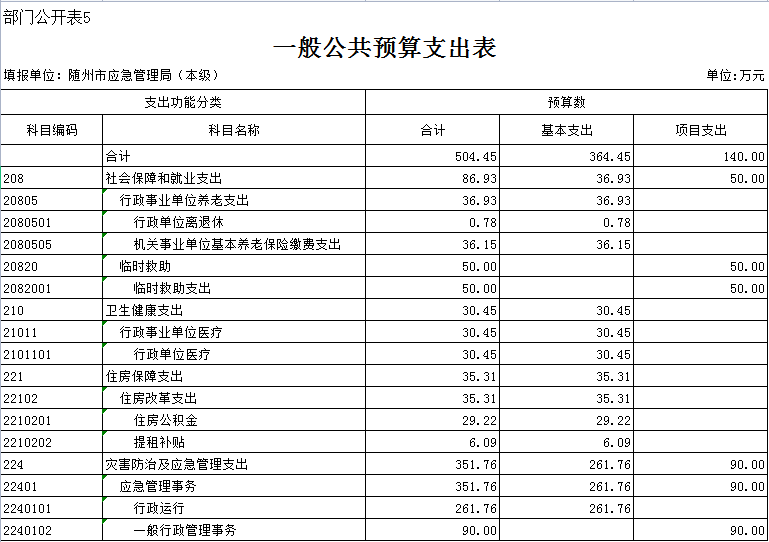 本年部門支出預算總額504.45萬元,其中:行政運行預算金額364.45萬元(其中人員支出300.41萬元、公用支出64.04萬元)、應急管理項目預算金額140萬元,歸口管理的行政單位離退休預算金額0.78萬元、機關事業(yè)單位基本養(yǎng)老保險繳費預算金額36.15萬元、行政單位醫(yī)療預算人員支出金額30.45萬元、住房公積金29.22萬元、提租補貼6.09萬元。較上年預算安排增加了50.52萬元,比上年預算安排增加了11.13%,主要原因為機構改革增人增資安排預算收入有所增加。