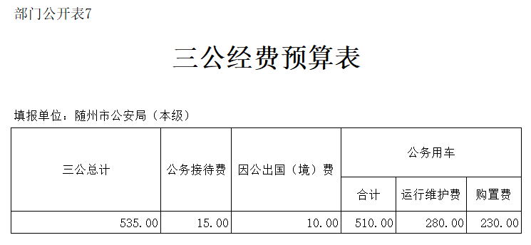 2020年隨州市公安局本級“三公”經費年初預算安排535萬元,比上年減少55萬元,同比減少9.32%。