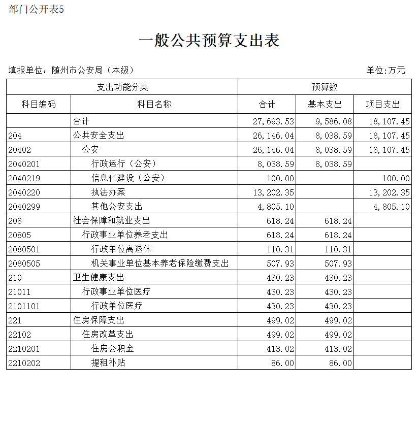 隨州市公安局本級財政撥款基本支出9586.08萬元,比上年增加411.85萬元,增加4.49%。