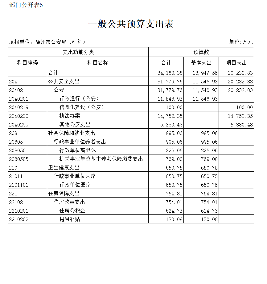 2020年隨州市公安局匯總預算公共安全支出35026.98萬元,比上年增加9909.39萬元,增加39.45%,主要項目支出增加;社會保障和就業支出995.06萬元,比上年減少104.23萬元,減少9.48%;醫療衛生支出650.75萬元,比上年增加66.73萬元,增加11.43%;住房保障支出754.81萬元,比上年增加49.18萬元,增加6.97%,均為正常人員增資。
