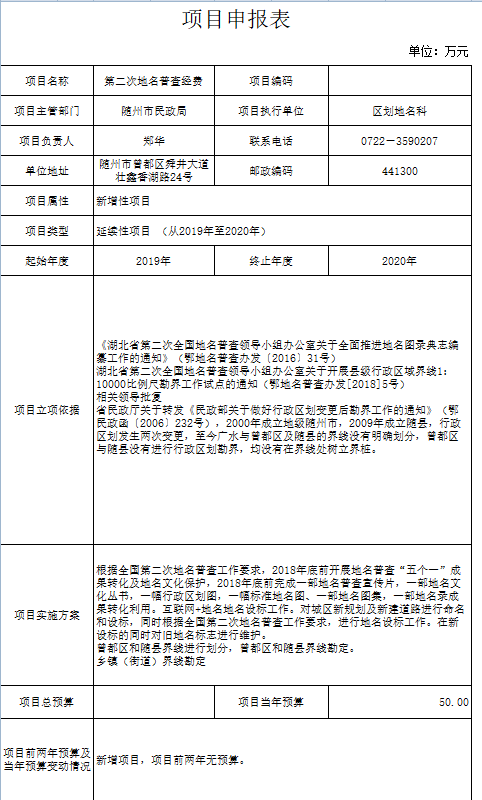 2019年,市民政局重點(diǎn)項(xiàng)目主要為第二次地名普查項(xiàng)目。預(yù)算資金50萬(wàn)元,年度主要完成隨縣、曾都勘界任務(wù)。