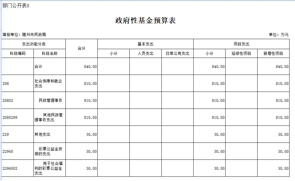 2019年,隨州市民政局機(jī)關(guān)政府性基金預(yù)算840萬(wàn)元,比上年增加840萬(wàn)元,同比增長(zhǎng)100%,主要原因?yàn)楦鶕?jù)安排,2019年將福彩公益金列入單位預(yù)算。