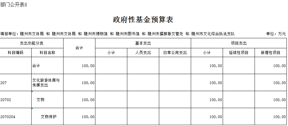 2019年預算中,財政預算隨州市文化體育新聞出版廣電局系統政府性基金100萬元。局本級政府性基金100萬元,比上年增加100萬元,增加原因是財政將體彩公益金統一調配使用,用來預算項目支出。