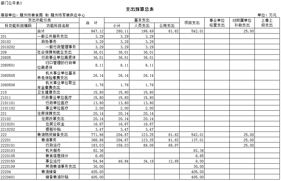 2019年糧食部門預算支出總額847.12萬元,比去年824.09萬元增加23.03萬元,同比增加2.79%,增加主要原因是軍糧供應中心其他收入增加。