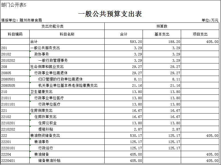 5、糧油物資儲備支出717.04萬元,其中糧油事務312.04萬元,糧油儲備405萬元