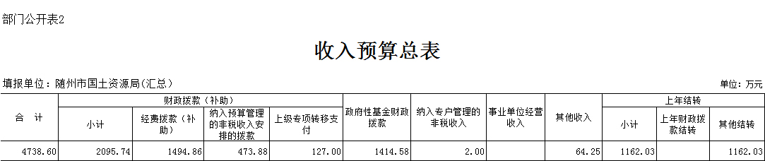 隨州市國土資源局2019年度系統匯總收入預算合計4738.60萬元,其中公共預算財政撥款(補助)2095.74萬元,政府性基金財政撥款1414.58萬元,其他收入64.25萬元,納入專戶的非稅收入2萬元,上年結轉1162.03萬元。比上年度預算收入總額5917.98萬元減少1179.38萬元,減少比例19.93%。主要原因是減少了集體土地確權登記、增減掛鉤、土地整治等項目收入。