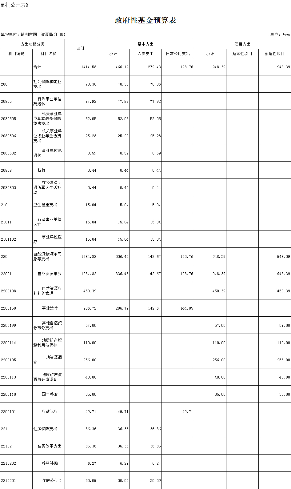 隨州市國土資源局2019年度系統匯總政府性基金預算合計1414.58萬元,比上年度預算安排總額1362.56萬元,增加了52.02萬元,增加比例3.82%。主要原因是2019年度本系統非稅收入預算減少,增加了政府性基金預算。