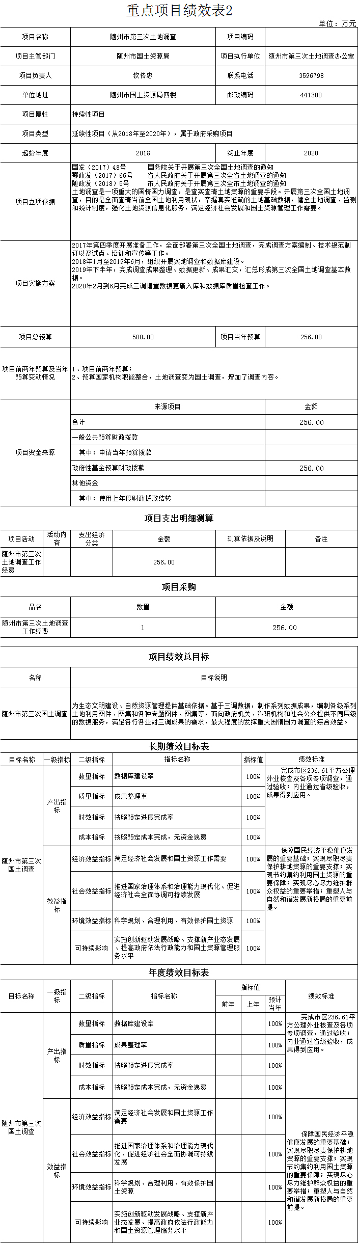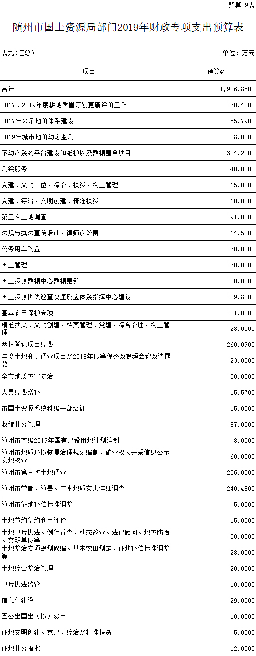 ??? 2、項目支出包括隨州市第三次土地調查、全市地質災害防治、隨州市曾都隨縣廣水地質災害詳細調查、隨州市本級2019年國有建設用地計劃編制、2017年公示地價體系建設、國土資源執法巡查快速反應體系指揮中心建設、隨州市征地補償標準調整等國土資源業務管理支出,主要用于保障全市各項國土業務的更好開展。