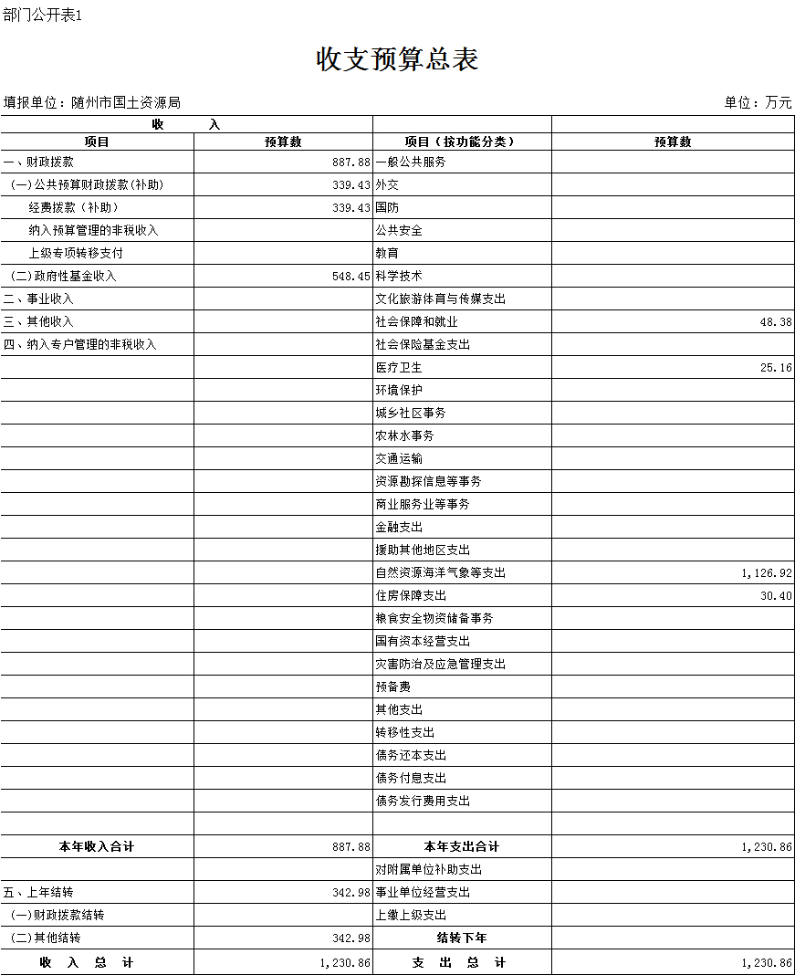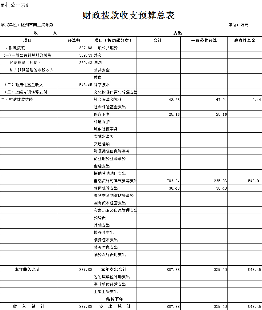 隨州市國土資源局本級2019年度財政經費撥款支出預算合計887.88萬元,其中一般公共預算財政撥款支出339.43萬元,政府性基金支出548.45萬元。比上年度預算安排總額1253.88萬元減少366萬元,減少比例29.19%。主要原因是上年結轉結余資金342.98萬元待支付。