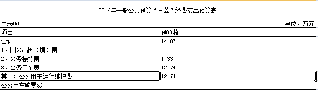 2016年中心“三公”經費預算安排14.07萬元,與2015年預算數14.07萬元持平。“三公”經費預算中,無因公出國(境)費用;公務接待費1.33萬元,與2015年預算數1.33萬元持平;公務用車費12.74萬元為公務用車運行費、無公務用車購置費,與2015年預算數12.74萬元持平。