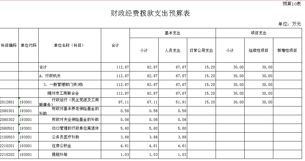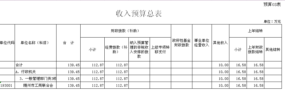 | 193001 | ????隨州市工商聯合會 | 21.76 | 11.76 | 0.73 | 0.73 | 10.00 | 11.03 | 11.03 | 11.03 | 11.03 | |||