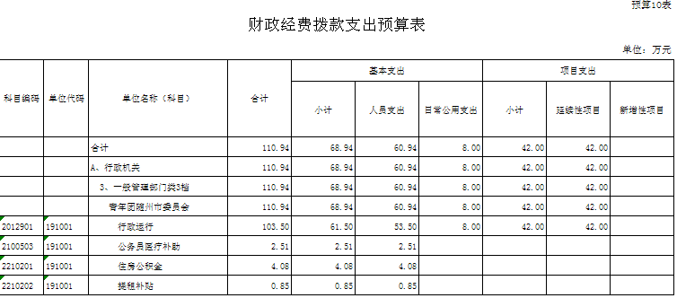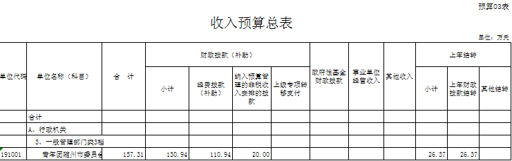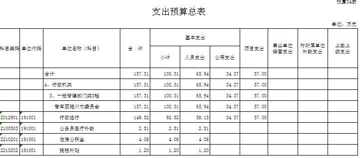 ??2016年團市委收入預算總額為164.15萬元,均為財政撥款(補助)收入,其中:財政撥款(補助)收入132.70萬元,上年財政結轉31.45萬元。支出預算總額為164.15萬元,其中:基本支出110.38萬元,項目支出53.77萬元。