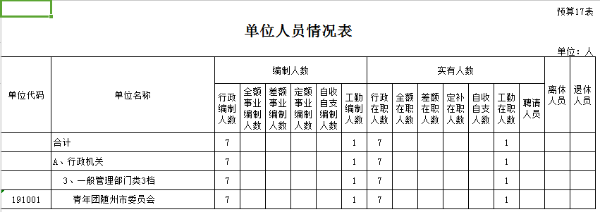 ??根據《中共湖北省委、湖北省人民政府關于印發〈隨州市黨政群機構設置及人員編制方案〉的通知》(鄂文[2000]46號)精神,設置共青團隨州市委員會。團市委機關共設置4個職能部室,分別是辦公室、組織宣傳部、學少權益部、青工青農部。團市委機關行政編制為7名,其中書記1名,副書記2名,科級領導職數4名。另核定機關工勤人員事業編制1名。