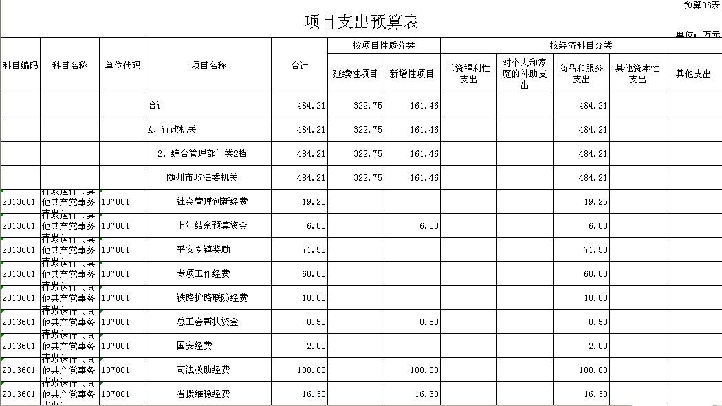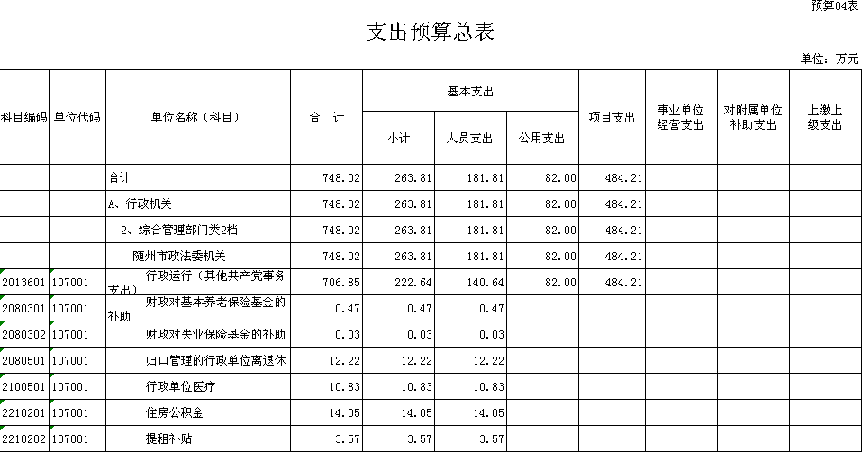 ????2016年市委政法委收入預算總額為748.02萬元,均為財政撥款(補助)收入,其中:財政撥款(補助)收入321.65萬元,上年財政結轉378.31萬元。支出預算總額為748.02萬元,其中:基本支出263.81萬元,項目支出484.21萬元。