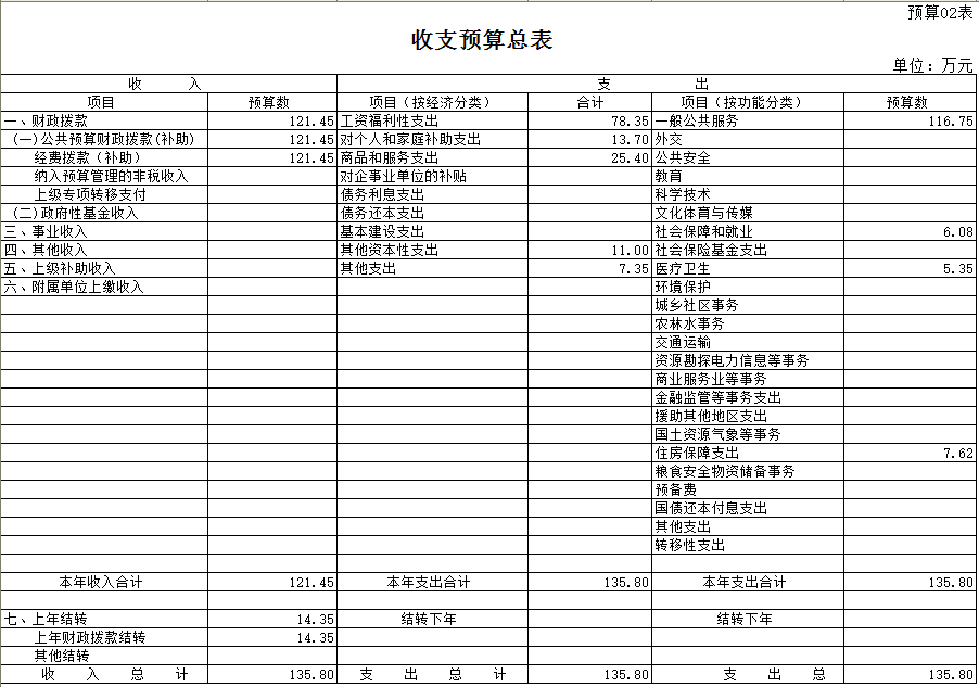 2016年財政撥款支出預算總額為121.45萬元,其中:一般公共服務102.40萬元,社會保障和就業(yè)6.08萬元,醫(yī)療衛(wèi)生5.35萬元,住房保障支出7.62萬元。