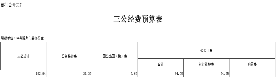 2017年市委辦公室“三公”經費支出預算102.04萬元,比上年上升7%,其中:出國(境)費用6.6萬元,公務車運行及維護費64.05萬元,公務接待費31.39萬元。