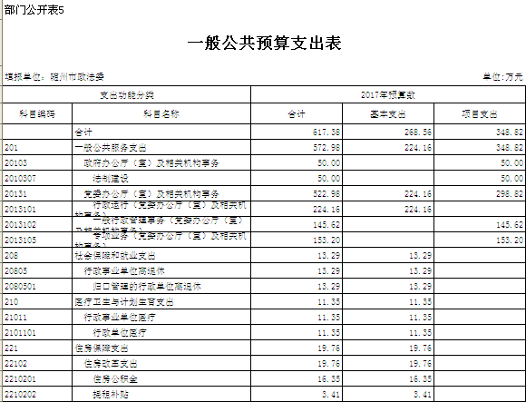 2017年財政撥款支出617.38萬元,其中,一般公共服務支出572.98萬元,社會保障和就業支出13.29萬元,醫療衛生支出11.35萬元;住房保障支19.76萬元。