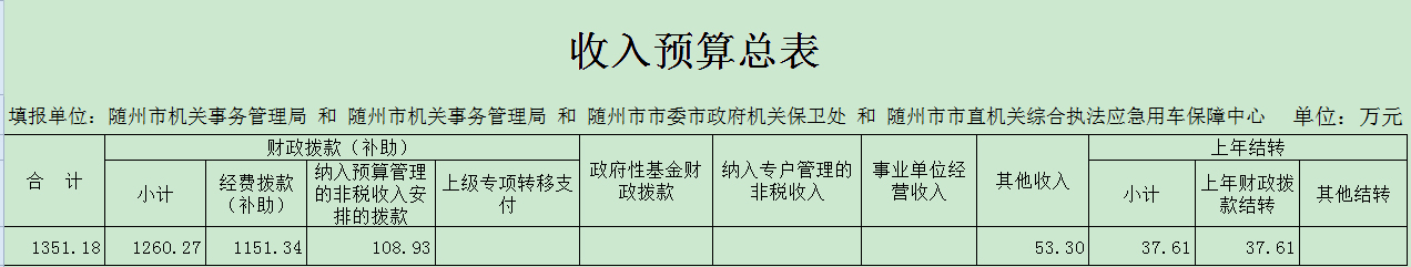 1、本部門匯總收入預算1351.18萬元,其中,財政撥款1260.27萬元(經費撥款1151.34萬元,非稅收入撥款108.93萬元),其他收入53.30萬元,上年結轉37.16萬元。本部門2016年新增二級單位1個(市直機關綜合執法應急用車保障中心),預算數據與上年無可比性。