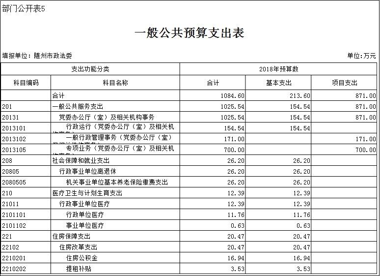2018年財政撥款支出1084.6萬元,其中,一般公共服務(wù)支出1025.54萬元,社會保障和就業(yè)支出26.2萬元,醫(yī)療衛(wèi)生支出12.39萬元,住房保障支20.47萬元。比上年增加467.22萬元,同比增43.08%,主要原因是增加了新增性項目——市政法機關(guān)信息化“1234”工程建設(shè)專項經(jīng)費預(yù)算支出。