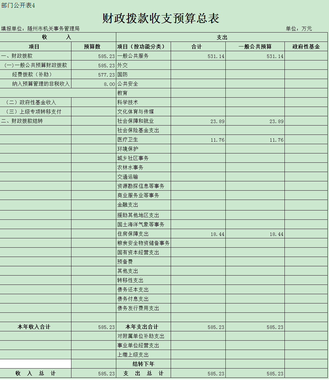 2、本級財政撥款支出預算數585.23萬元,較上年預算660.28萬元下降11.37%。下降的主要原因是局本級退休人員支出本年列入了市社保局支出。