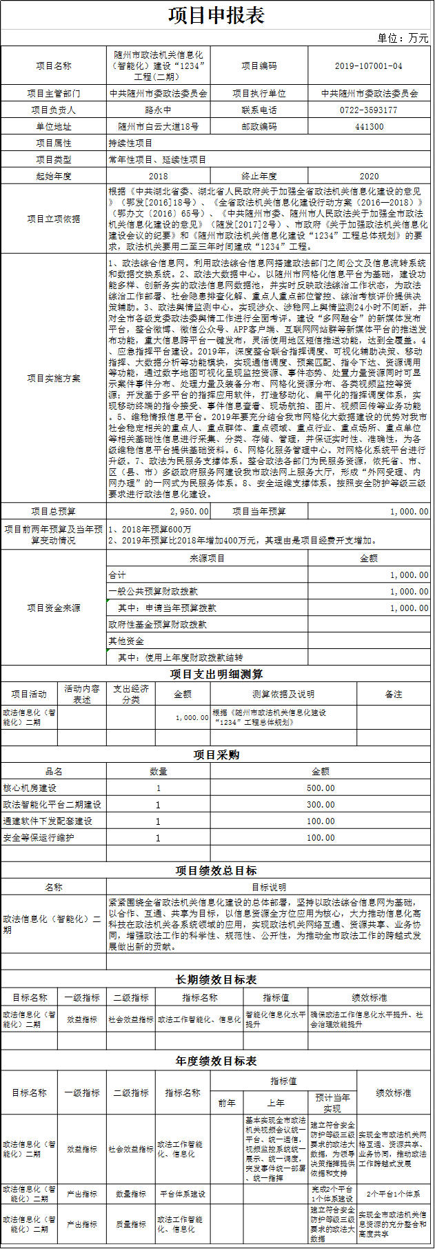 2019年部門政府采購支出1000萬元,繼續(xù)用于市政法機關(guān)信息化“1234”工程建設(shè)。其中,核心機房建設(shè)費用500萬元,政法智能化平臺二期建設(shè)費用300萬元,省委政法委通建軟件下發(fā)配套建設(shè)費用100萬元,安全等保運行維護費用100萬元。比上年增加400萬元,同比增66.67%,主要原因是:市政法機關(guān)信息化“1234”工程建設(shè)按計劃如期展開,增加了經(jīng)費預(yù)算支出。