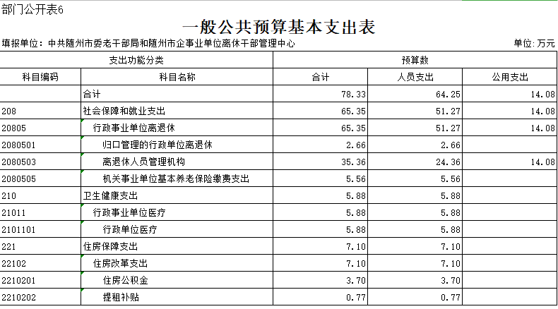 1、隨州市委老干部局(含隨州市企事業單位離休干部管理服務中心)2019年支出預算總額為208.33萬元,按支出項目經濟類別劃分:工資福利支出61.59萬元,占支出預算總額的29.6%,商品和服務支出14.08萬元,占支出預算總額的7%,項目支出130萬元,占支出預算總額的62.4%。按支出功能科目劃分:社會保障和就業支出195.35萬元,占支出預算總額的93.8%,衛生健康支出5.88萬元,占支出預算總額的2.8%,住房保障支出7.1萬元,占支出預算總額的3.4%。較上年預算安排增加78.19萬元,增加60.1%。增加原因為項目經費中的110萬上年作為財政社保科的預算,今年直接在市委老干部局預算中編制,導致預算增加。