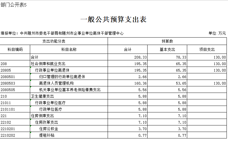 1、隨州市委老干部局(含隨州市企事業單位離休干部管理服務中心)2019年財政撥款支出預算208.33萬元,較去年增加78.19萬元,增加60.1%。增加原因主要為本年度的125萬元的項目經費中的110萬上年作為財政社保科的預算,今年直接在市委老干部局預算中編制,導致預算增加。